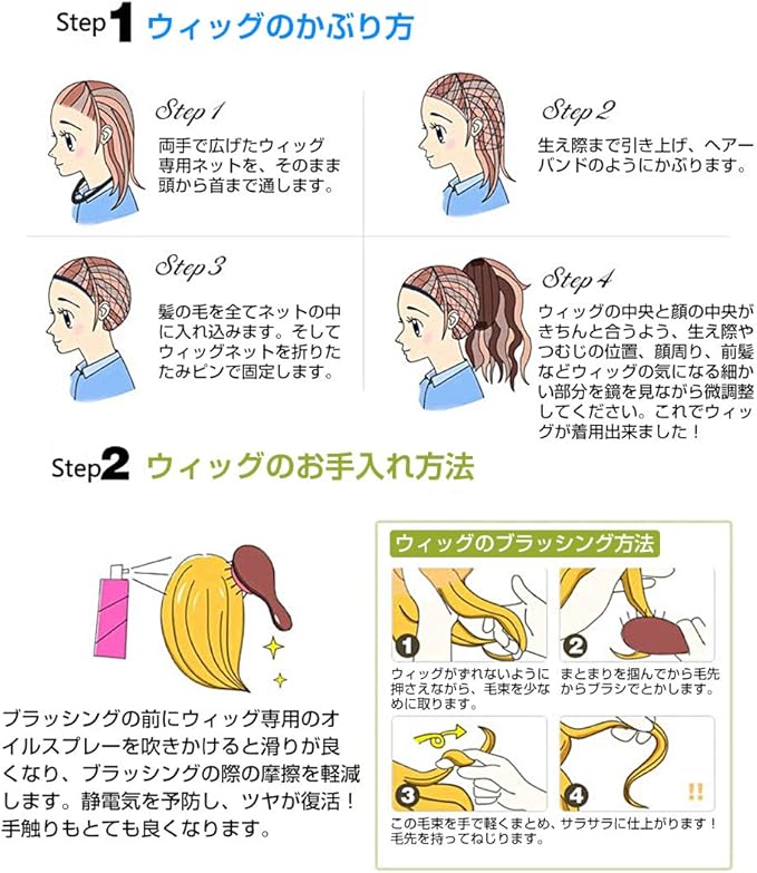 【ウィッグの情報】高級耐熱ファイバーを採用、今まで気になっていたウィッグ特有のテカリ感を抑え、よりに近づけたしっとりとした柔らかな手触り。耐熱160℃なので、コテ/ドライヤー/アイロンなどで好みの髪型に整えることができます。★付属品:フルウィッグ専用ネット2個付き