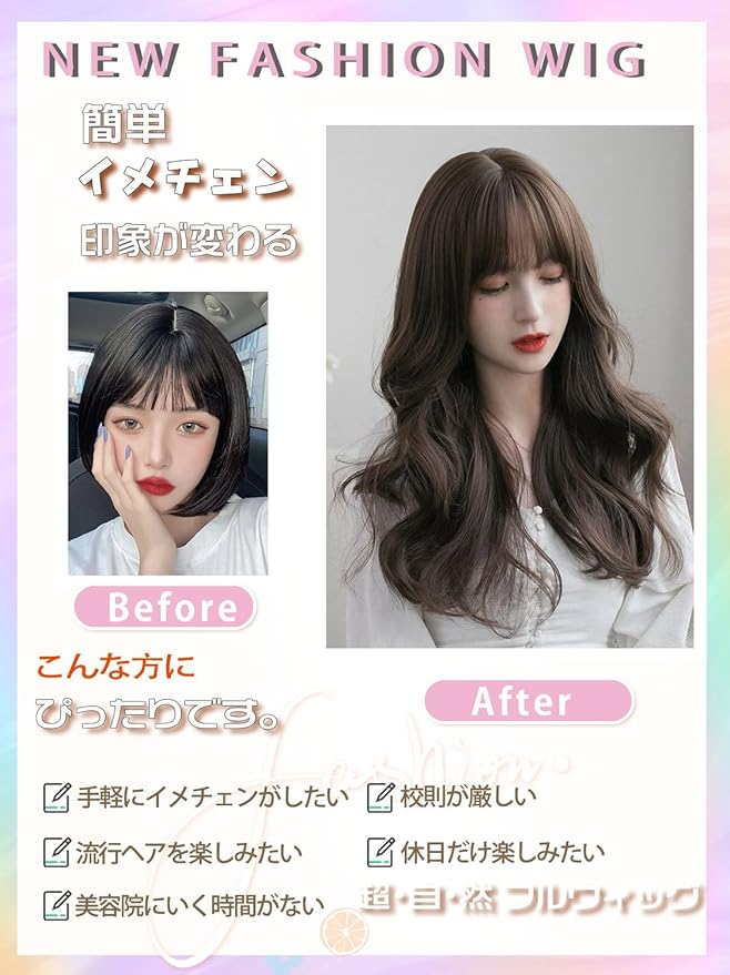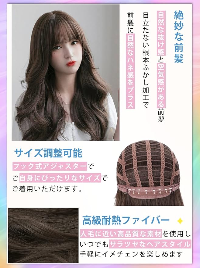 【ウィッグ素材】高品質耐熱ファイバーを使用の耐熱ウィッグ、コテ・アイロンも使用OK(160度まで)。光沢の少ない「ファイバー」を採用し、に近いしっとりとした自然な手触りを作成しています。【サイズ調整可能】ウィッグがサイズ調整できるので、ぴったりなサイズでご着用いただけます。