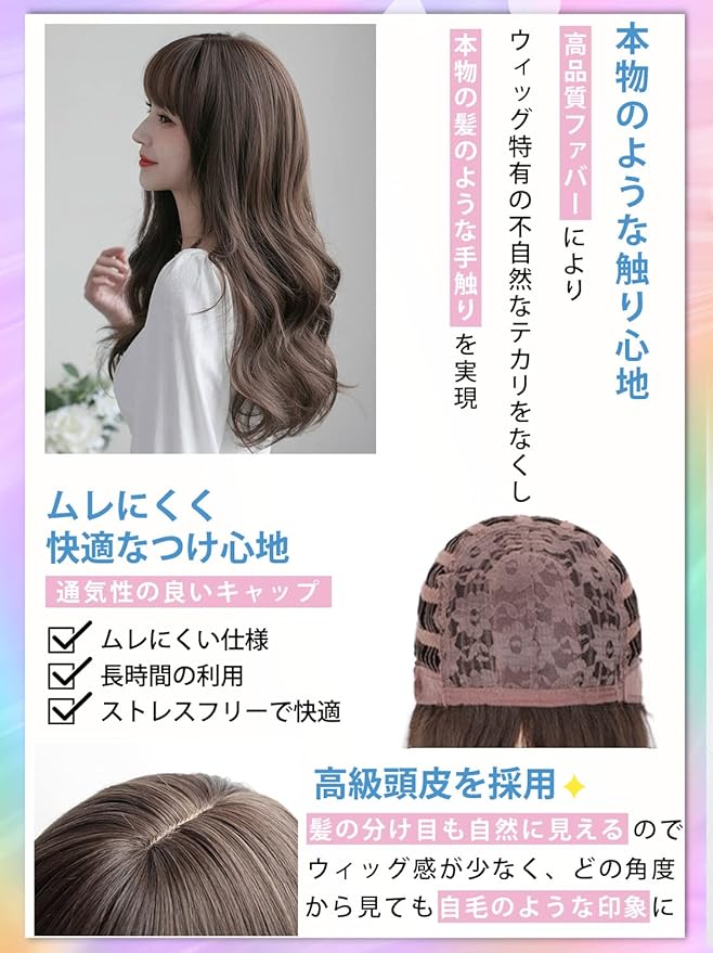【自然なつむじ】高級人工頭皮使用により、光を自然に反射。手触りもしっとりナチュラル。小顔効果がありロングヘアウィッグ、つむじには、頭皮に近いカラーのI型人工頭皮を採用。トップもふんわりと立ち上がる植え方になり、生え際もより自然に。
