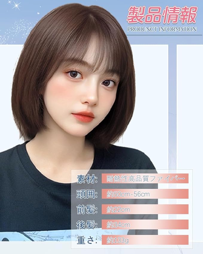 ☀【商品情報】①サイズ:前髪:生え際から毛先まで約12cm 後髪: 頭頂部から毛先まで約34cm 重量:約133g ②:頭囲約50〜56cmの方に適しています ③素材:高品質の耐熱繊維を使用し、160度までアイロンがかかるので、アイロン使用OKです ④セット内容:ウィッグ+専用ヘアネット+前髪コーム(色ランダム)+説明書