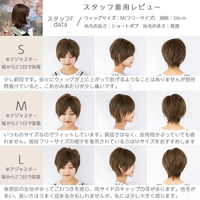 サイズ:Sサイズ 頭囲:約47cm~54cm Mサイズ 頭囲:約48cm~57cm(Mサイズが従来のフリーサイズと同等のサイズ感です) Lサイズ 頭囲:約50cm~60cm ※アジャスターでサイズ調整可能※ウィッグに伸縮性がある為、表記サイズより多少誤差があります。