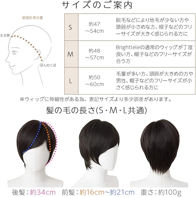 髪の長さ(S・M・L共通):後髪:約34cm 前髪:約16cm~約21cm 重量(S・M・L共通):100g