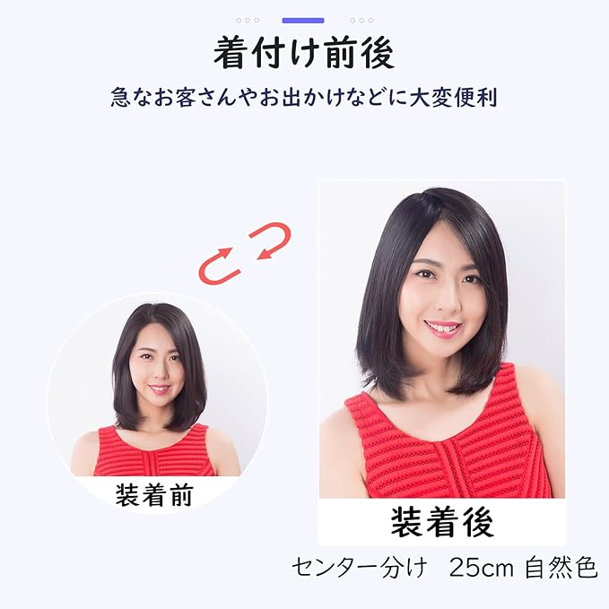 幅広い人工肌:三重構造と引き抜き式の植毛方式を採用しています。そのため、髪の結び目が隠れており、まるで地肌から直接生えているかのように見えます。近距離で見ても非常にリアルであり、上から見ても心配はありません。 ご注意:はクセがつきやすいので、届いたそのままの状態で使用することはおすすめいたしません。 商品が届きましたら、根元からしっかり水スプレーで濡らし、きれいに梳かして自然乾燥させます。 自然乾燥後、ストレートアイロンでセットし、きれいに整えてからご使用ください。