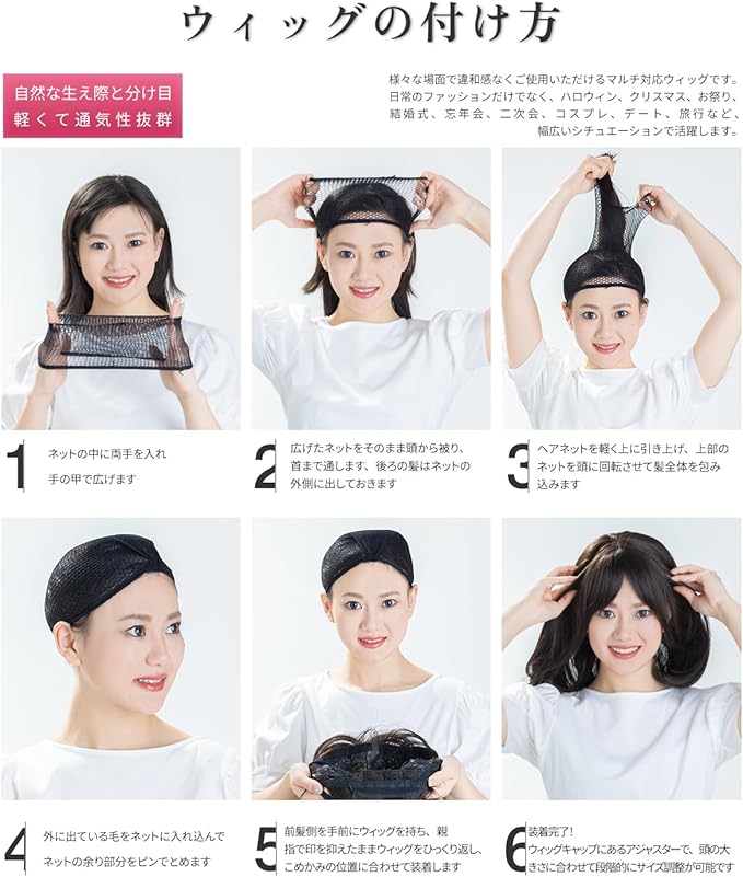 ✅ 安心のセット構成:ウィッグ、専用ブラシ、スタンド、ウィッグネット(2枚)、ヘアピン、生え際用両面テープ、取扱説明書。管理用品一式付きで、使用後のお手入れもラクラク!