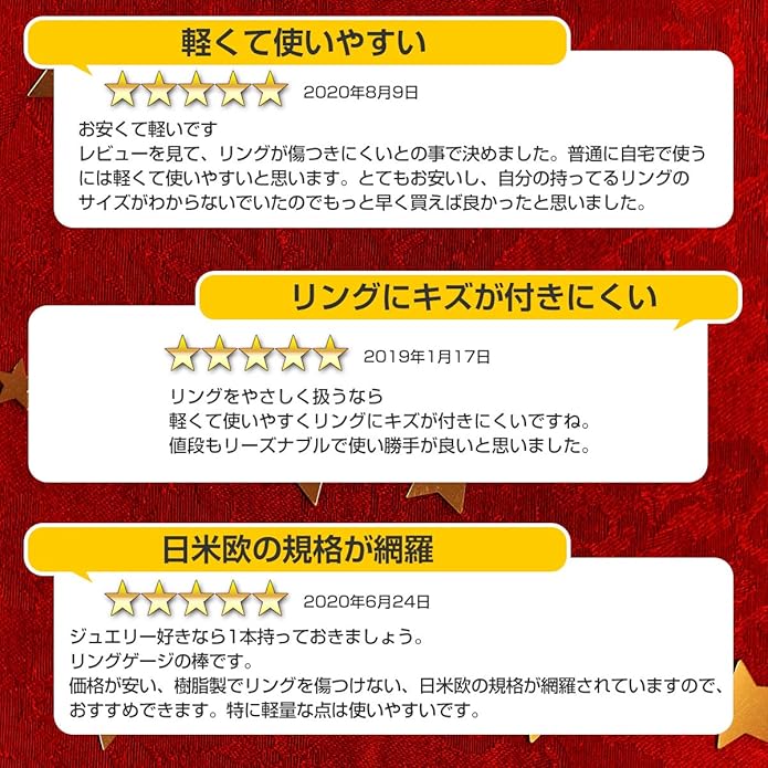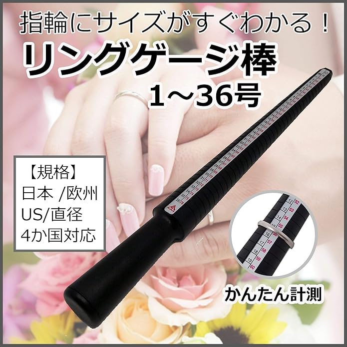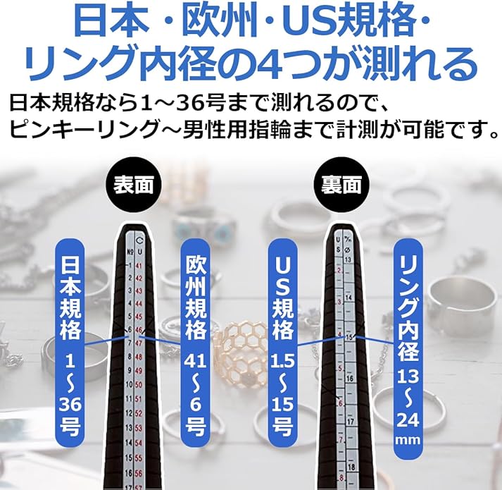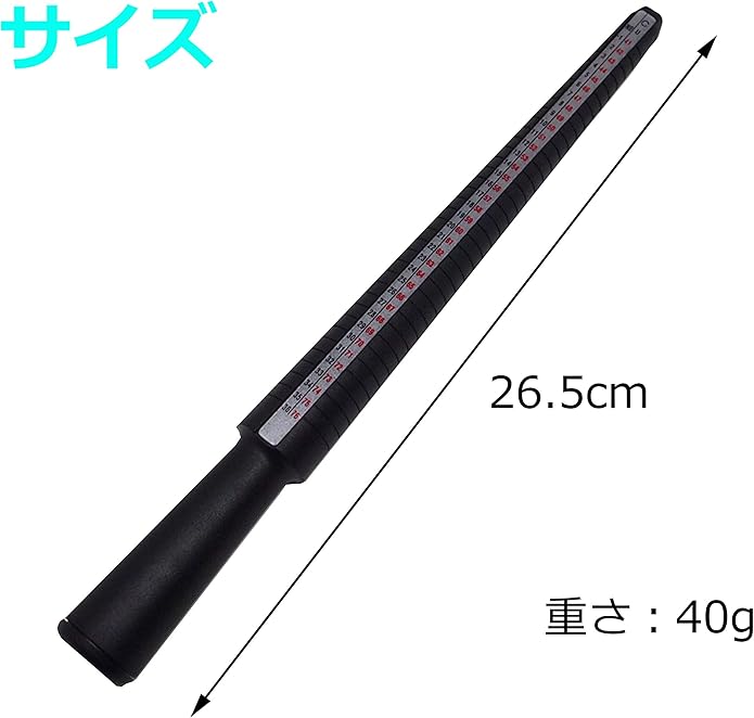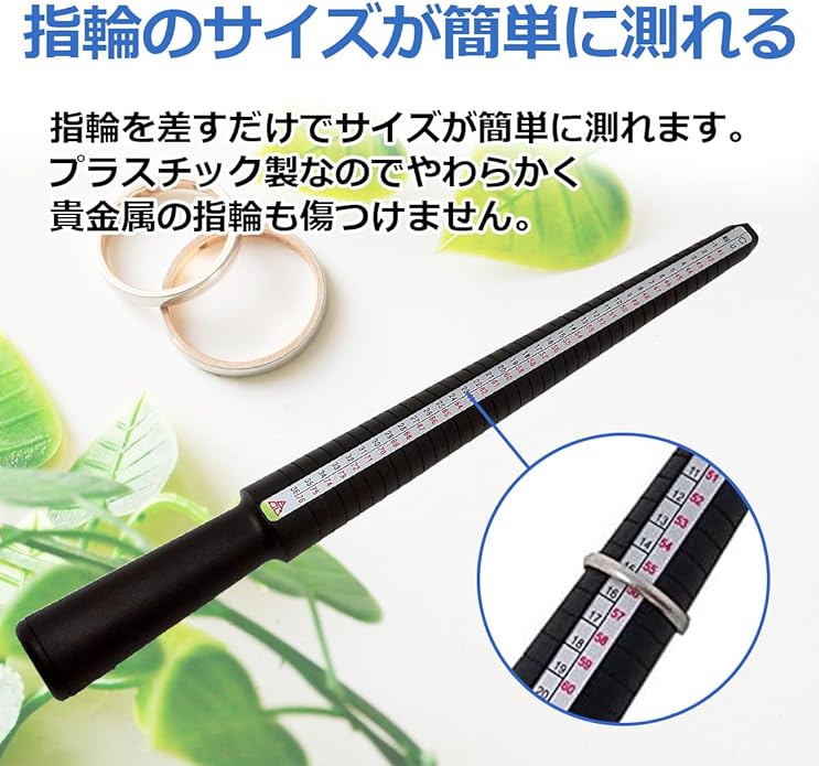 リング内周(単位:mm)と同じ数値なのでこれらも同時に測定できます。軽くて持ち運びに便利なプラスチック製で輸入業者やジュエリー店の方にも好評です。
