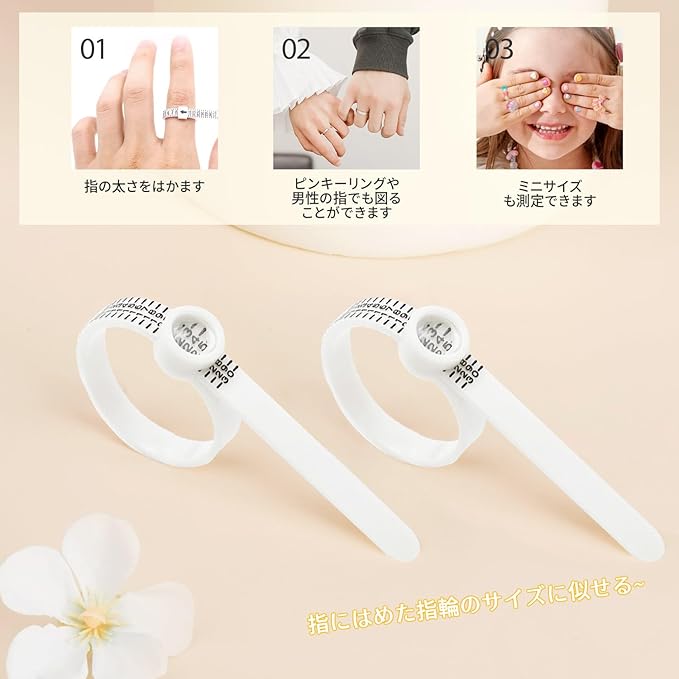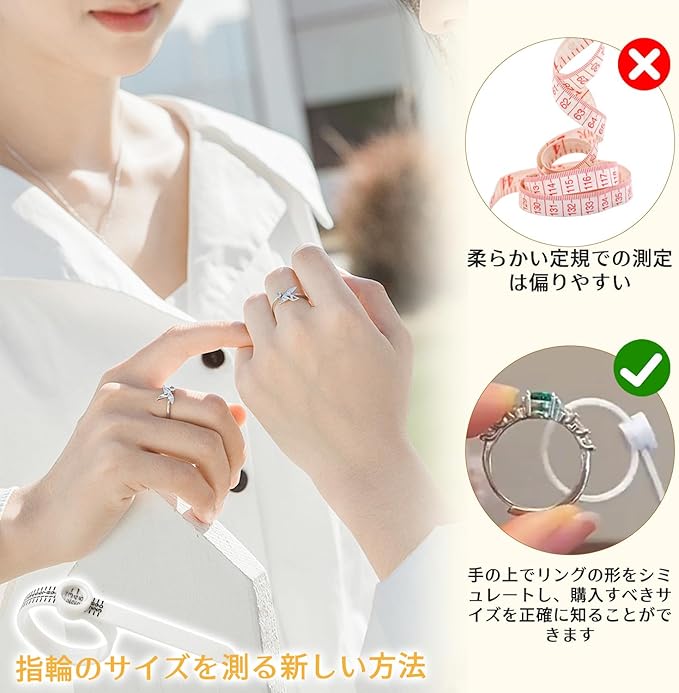 【指輪用ソフトメジャー】柔軟な素材で、指輪表面を傷つけず、使用が安全で信頼できます。さらに、指を優しく包み込むようにして測定でき、に基づいたデザインとなっています。