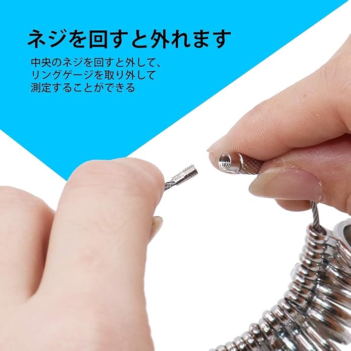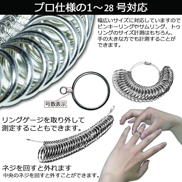 【リングの管理がしやすい】:リングゲージを円環で大きさ順にまとめています。そのため、リングの種類が多くて管理がしづらいという点に応えています。自分の指のサイズにあるリングを見つけやすく、そのままはめることができるのがうれしい点です。