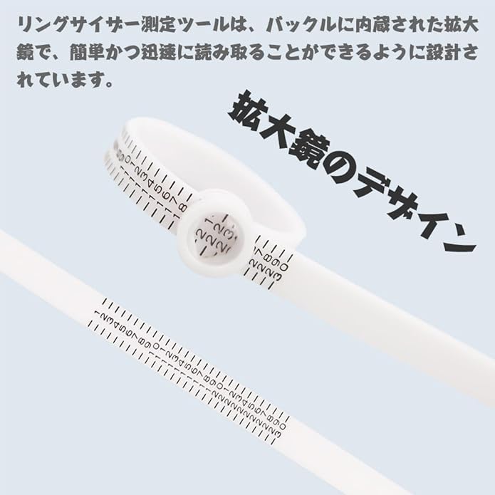 拡大鏡のデザイン:リングサイザー測定ツールは、バックルに内蔵された拡大鏡で、簡単かつ迅速に読み取ることができるように設計されています。
