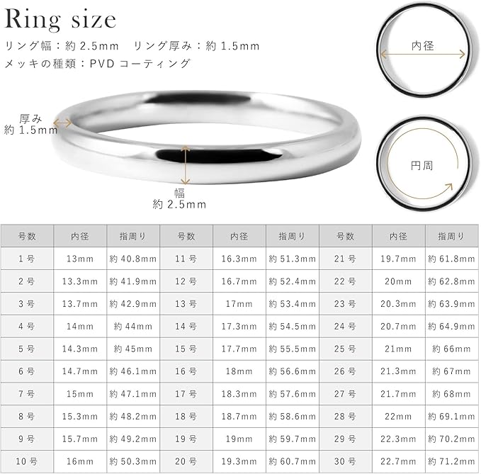・デザイン:表面は鏡面加工、甲丸(カマボコ)の型を採用しており、着け心地が滑らかになるよう、内側・外側部分を丸みをもたせておりますので、柔らかな指当たりとなっております。