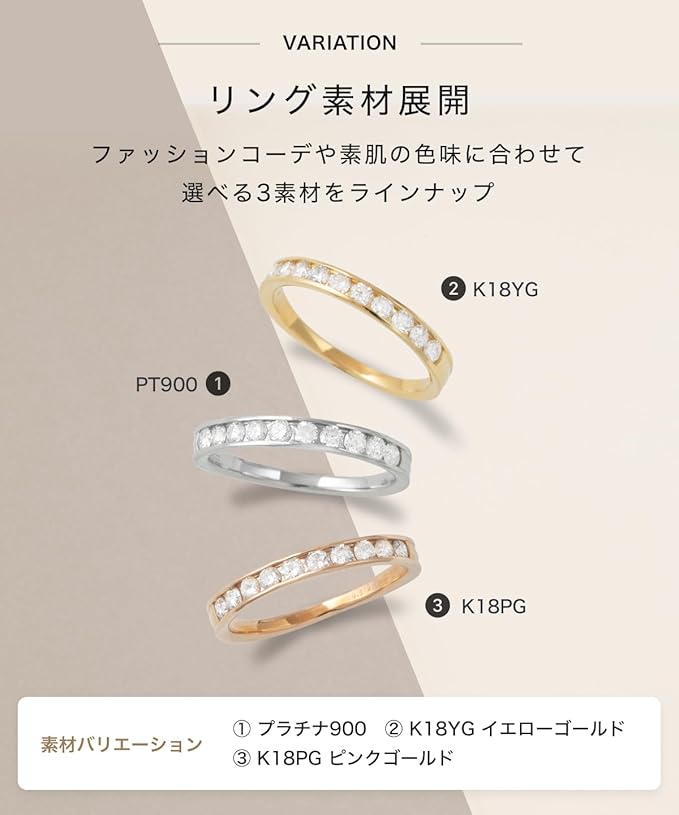 【永遠の愛の象徴「エタニティリング」】英語で永遠を意味する「Eternity」の意味を持つエタニティリング。途切れることなく敷き詰められたダイヤモンドは「永遠の愛」の象徴とされています。バッグや物を掴んだときに傷をつけたり、引っ掛けてダイヤモンドが落ちてしまう・・・そんな心配がないから日常生活や特別な席でも着けられ、様々なシーンで華やかさを演出できるのが特徴です。