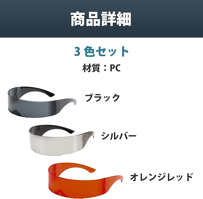 うれしい3色セット:ブラック、オレンジレッド、シルバーの3色のサングラスが揃ったセット品となっています。一緒にイベントに参加する仲間とシェアして使ったりするのもよいでしょう。