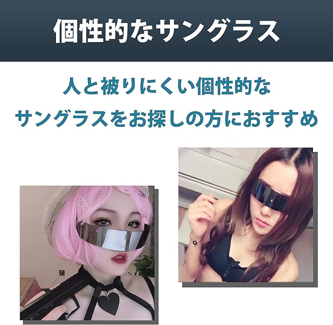 近未来テイストのサングラス:近未来を感じさせるテイストが魅力のサングラスセットです。人と被りにくい個性的なサングラスをお探しの方におすすめの商品です。