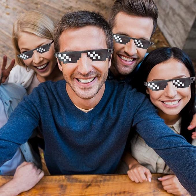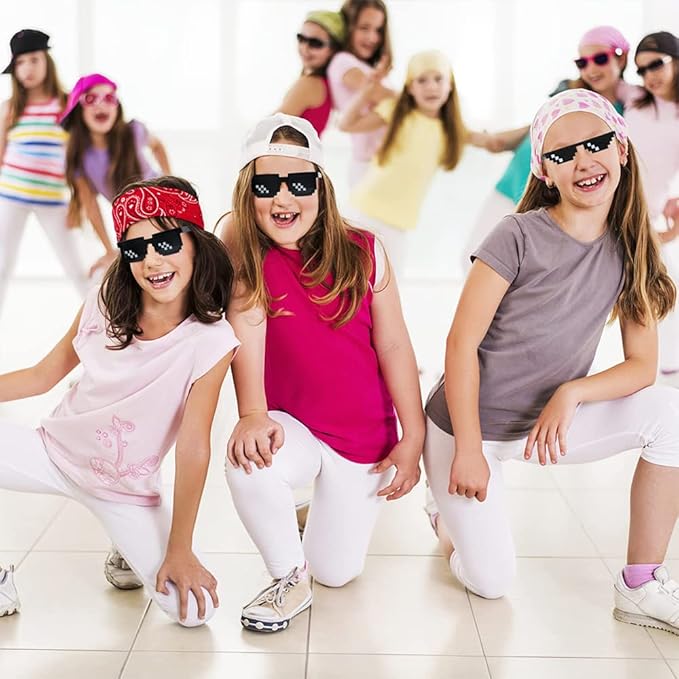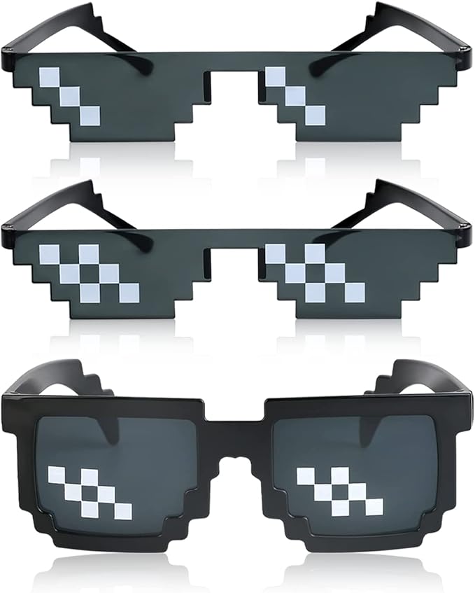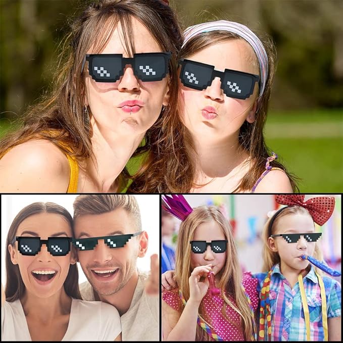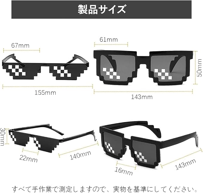 【製品仕様】モザイクサングラス3点セット(ブラック6/12/12ピクセル)。サイズは自由で、大人と子供向けのサングラスは、男女兼用。