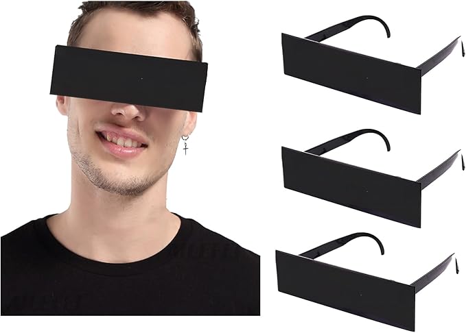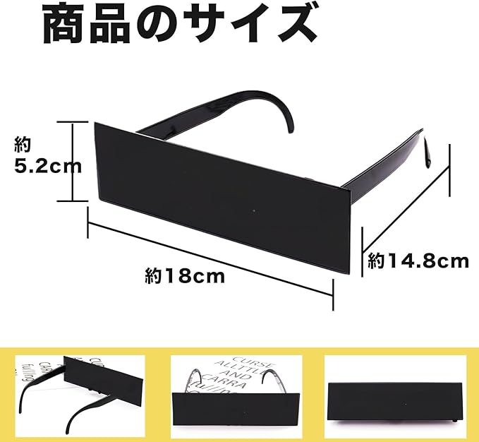 目隠しメガネは、長方形、帯状のデザインがユニーク。コスプレ、顔出しNGな恥ずかしがり屋なあなた、罰ゲームなど大き目のフォルムで思わず二度見のインパクト!顔ばれしたくない写真や動画、SNS撮影、配信用にもおススメ。