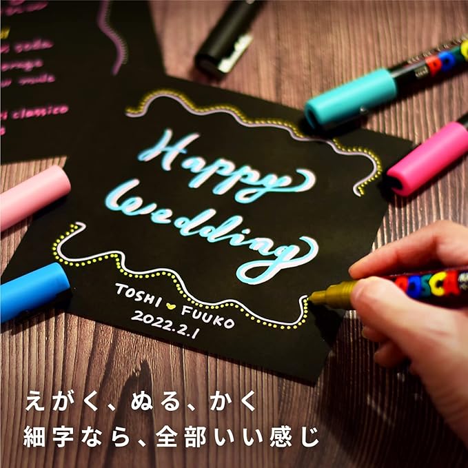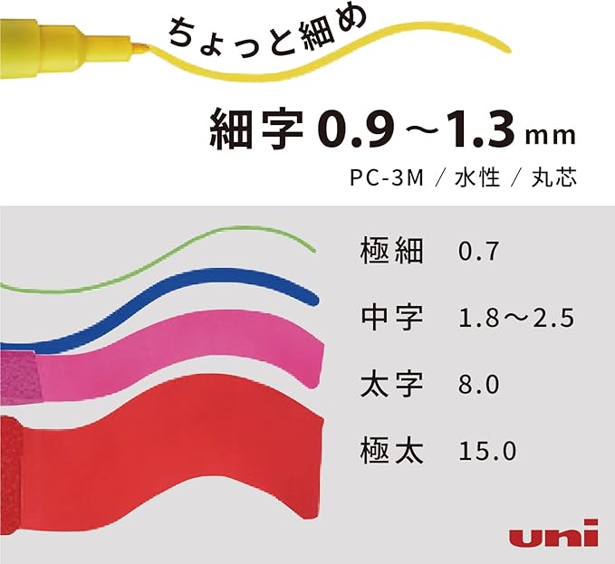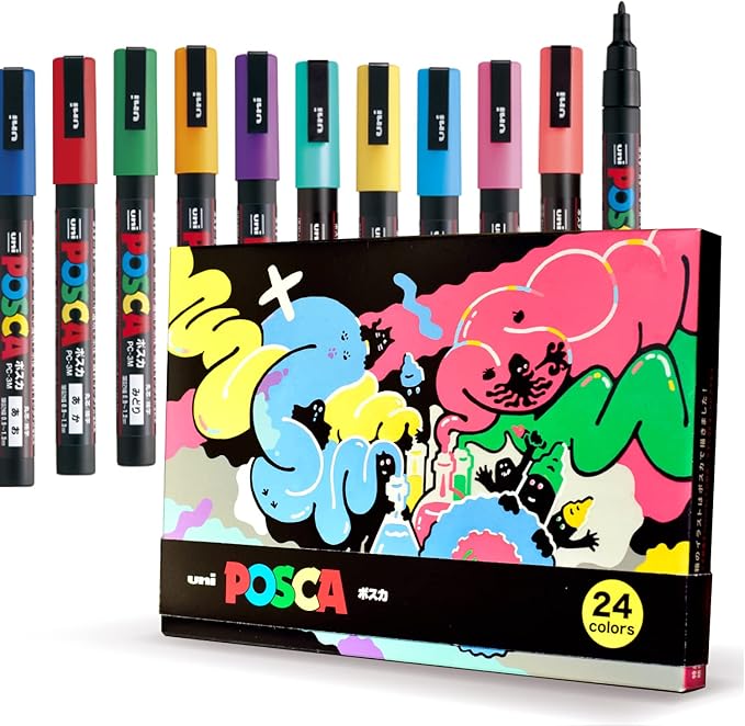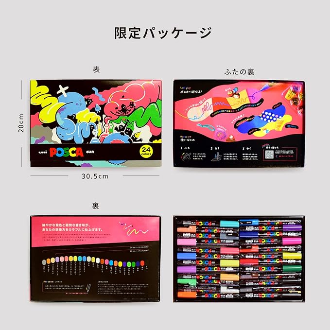 ポスカPC3M細字タイプ(0.9mm~1.3mm)24本入り。パッケージには24色分のカラー見本や、使用例などわかりやすく記載してあります。