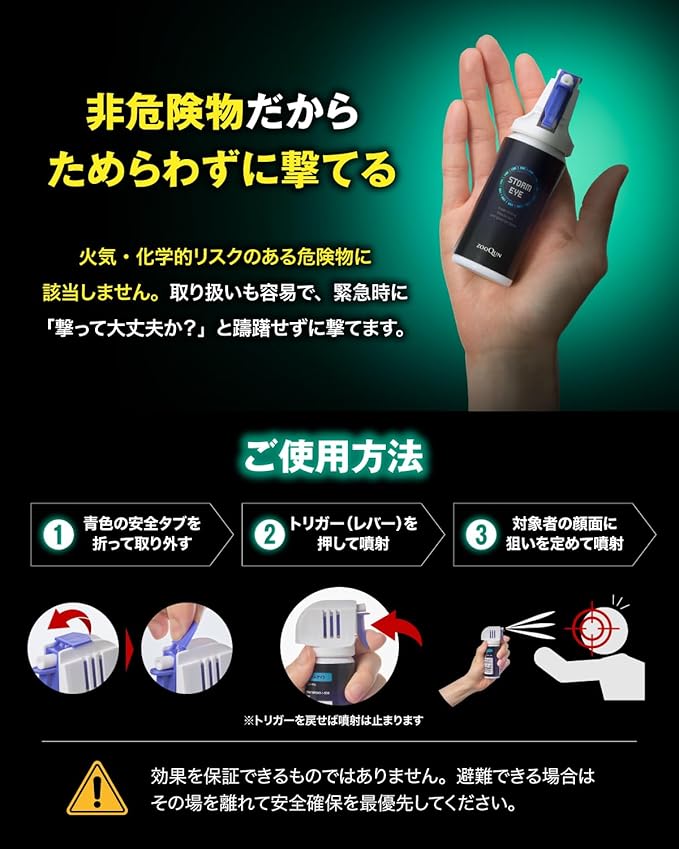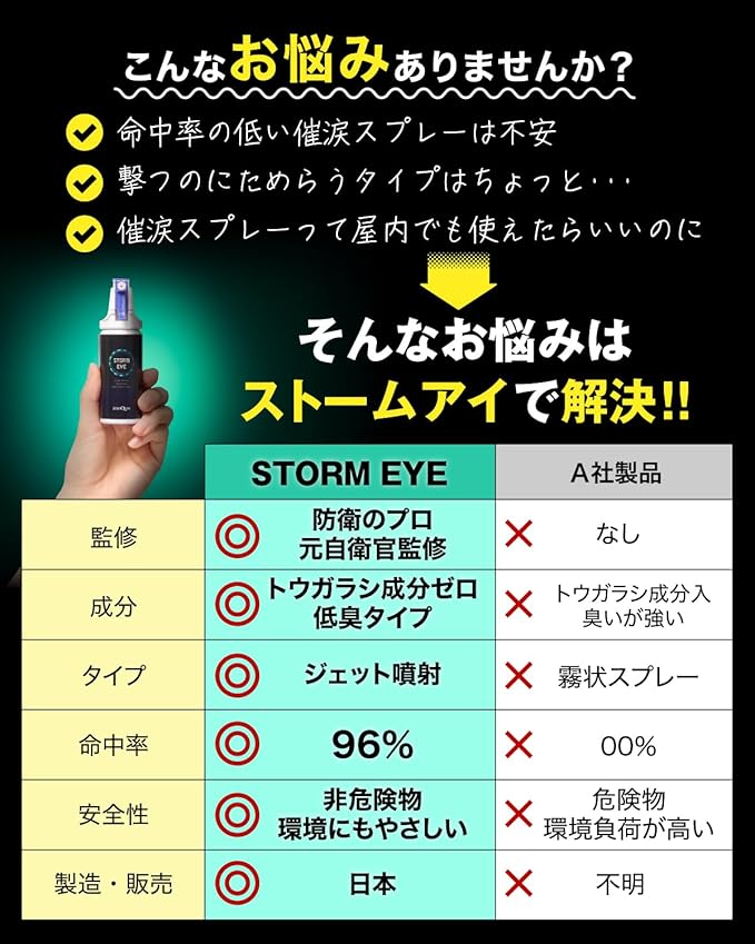 【ジェット噴射トリガーで誤射・逆風にも強い】 従来の霧状スプレーは噴射方向がわかりづらく、誤射や風による拡散リスクがありますが、 STORM EYEは操作しやすいトリガーとジェット噴射で、確実にターゲットを狙えます。
