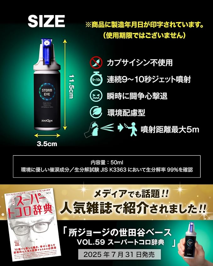 【従来品のリスクを排し躊躇うことなく使える次世代】 最大約10秒間、噴射距離約5m、従来品に勝る噴射時間と噴射距離 生分解性99%(生分解試験JISK3363)環境に優しい催涙成分 内容量:50ml 商品に製造年月日印字あり(※使用期限ではございません)