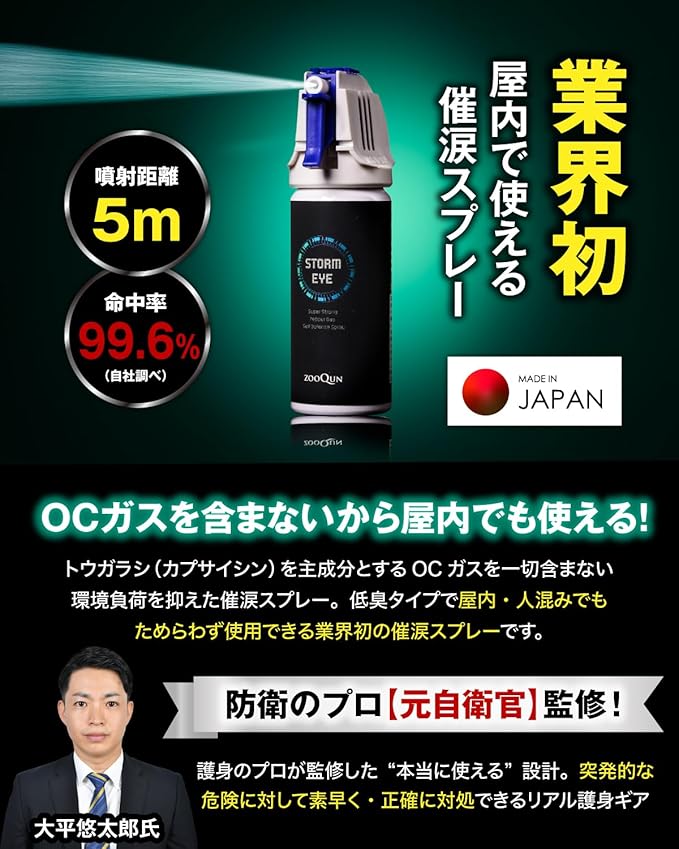 【業界初屋内で使える】 催涙効果を保ち OCガスを一切含まず環境負荷を抑えた、 ”屋内で使える"" 業界初のです。
