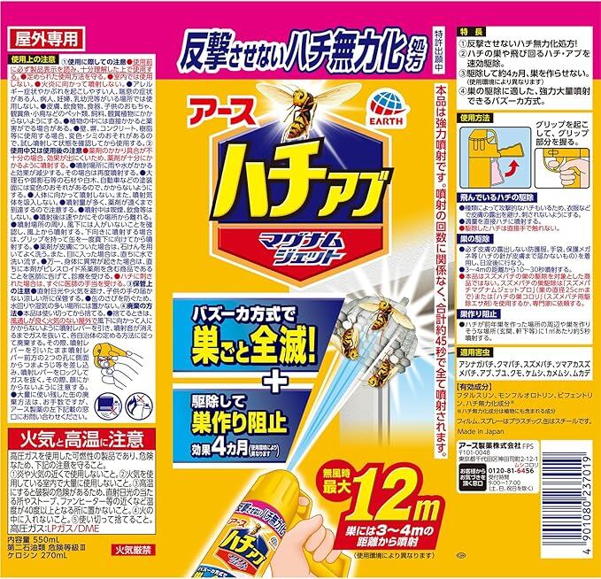 【適用害虫】アシナガバチ、クマバチ、スズメバチ、ツマアカスズメバチ、アブ、ブユ、クモ、ケムシ、カメムシ、ムカデ