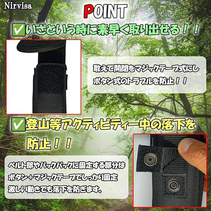 激しい動きでもベルトやバックパックに通すベルト部はボタン+マジックテープでしっかり固定 しアクティブ中の落下を防ぎます。