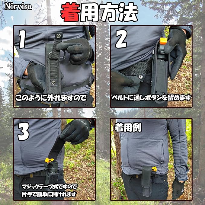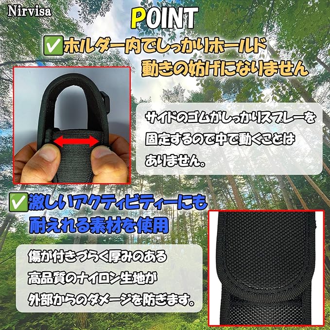 サイドのゴムがしっかりスプレーを 固定、ホルスター内でしっかりホールド、動きの妨げになりません。