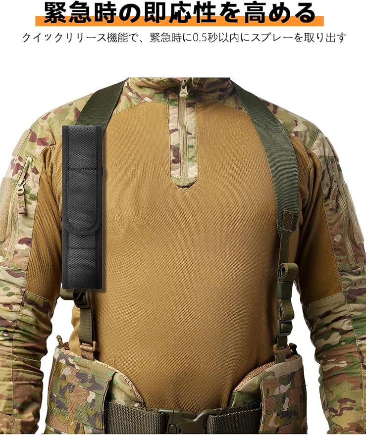 【緊急時に素早く取り出せる片手操作設計】アウトドアのプロが求める「秒単位の応答性」に応えるため、マジックテープとボタンの二重固定を採用。片手操作でも確実にスプレーを取り出せ、突然のクマ接近時や夜間の緊急時でも冷静な対応をサポートします。