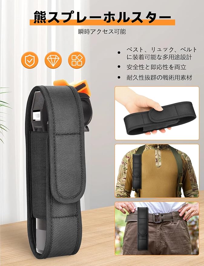 【激しい動きや過酷な環境に耐える耐久設計】登山中の急斜面や岩場登りでもホルダーがズレないよう、ベルト固定部をマジックテープ+ボタンで強化。サイドの高弾性ゴムがスプレーを完全固定し、動きの邪魔になりません。防水ナイロン素材により、雨や雪山の湿気からスプレーを保護。厚手ナイロンと補強ステッチで岩場の摩擦にも耐え、自社過酷テストで劣化ゼロを実証しています。
