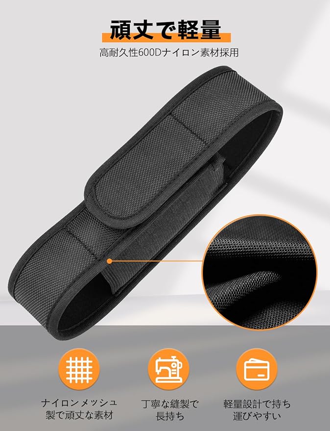 【軽量コンパクトで長時間の装着感ゼロ】重量39g・サイズ縦19.5cm 幅5cm 厚さ6.5cmの超軽量設計。ベルト幅7cm以下に対応し、バックパックや他のギアと干渉せず、8時間以上の装着でも疲れません。