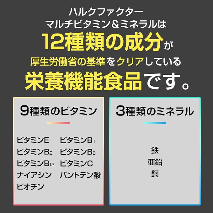 ✅【栄養機能】ハルクファクター &ミネラルは厚生労働大臣が定めた基準値をクリアした『栄養機能』です。栄養機能(ビタミンB1・ビタミンB2 ・ビタミンB6・ビタミンB12・ビタミンC・ビタミンE・ナイアシン ・パントテン酸・ビオチン・鉄・亜鉛・銅)※栄養機能とは、特定の栄養成分の補給のために利用されるで、栄養成分の機能を表示するものをいいます。