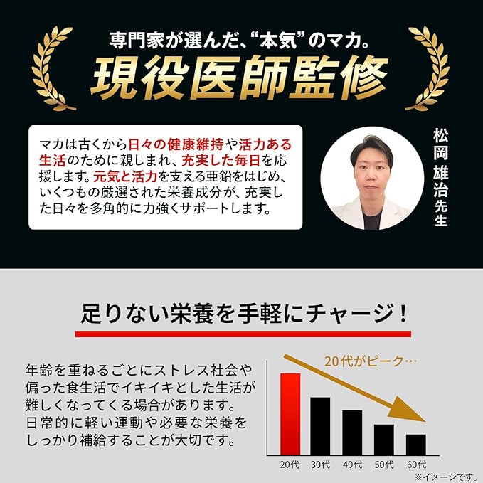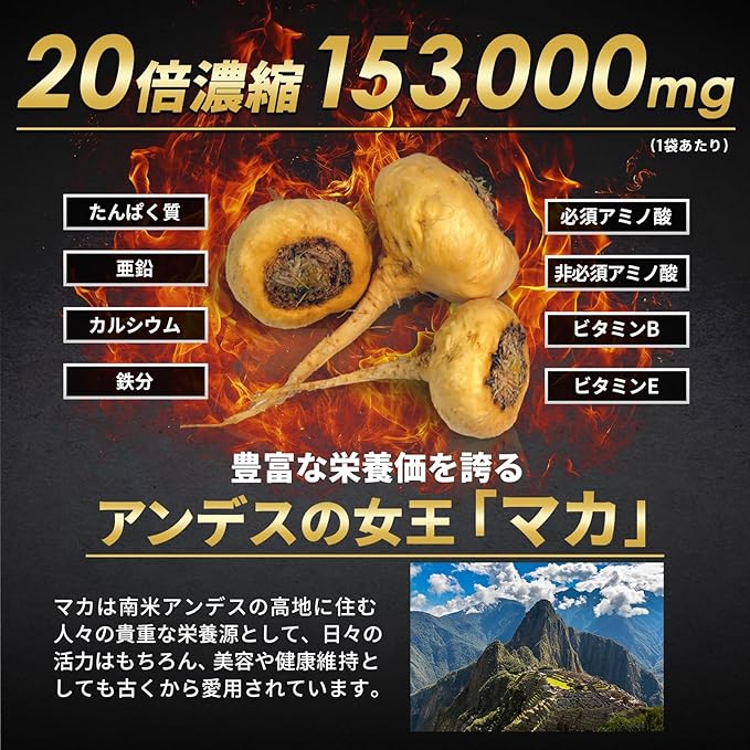 【業界屈指の配合】20倍濃縮マカ153,000mg配合! アンデスに伝わる女王の名を冠す「 マカ 」に着目し、充実した毎日を送りたい方におすすめの医師監修です。
