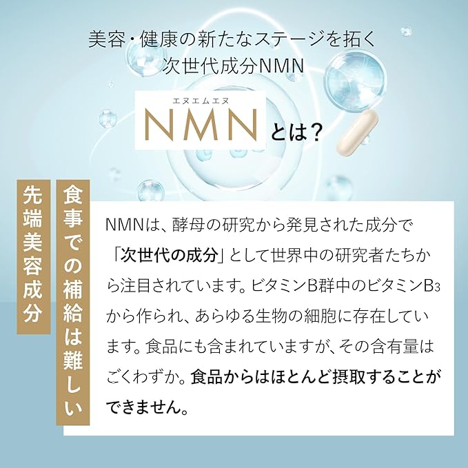商品特長 本品は国産NMNを高配合した【栄養機能】です。ビタミンEは抗酸化作用により体内の脂質を酸化から守り、細胞の健康維持を助ける栄養素です。