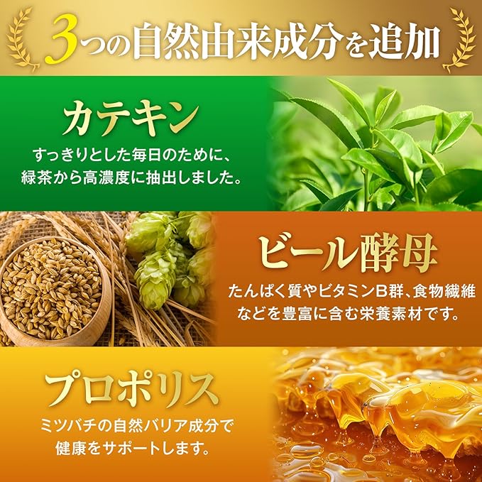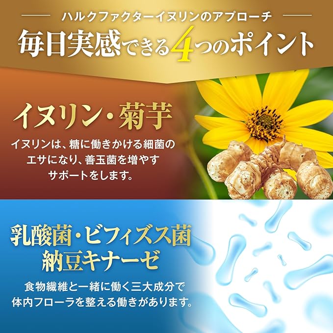 【4つのアプローチ】①『スッキリサポート』イヌリン・キクイモが内側からスッキリ、キレイに、②『菌活サポート』乳酸菌・ビフィズス菌・ナットウキナーゼで体内フローラを整える、③『抑制サポート』『抑制サポート』カテキン・サラシア・植物酵素・ビール酵母・プロポリスで余分なものをバリア 、④『美容サポート』ビオチン・ビタミンEでキレイの土台をサポート。