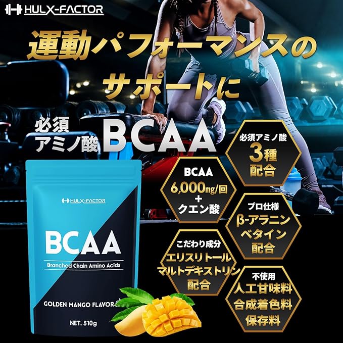 【圧倒的な栄養価】BCAAは、ロイシン・バリン・イソロイシンの比率が非常に重要となり、ハルクファクターはアミノ酸の黄金比2:1:1で構成されています。L-ロイシン 3,000mg/L-バリン 1,500mg/L-イソロイシン 1,500mg/β-アラニン 500mg/ベタイン(TMG トリメチルグリシン)2,500mg *1食あたり
