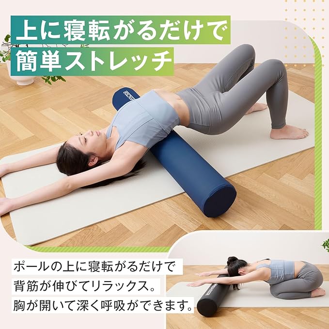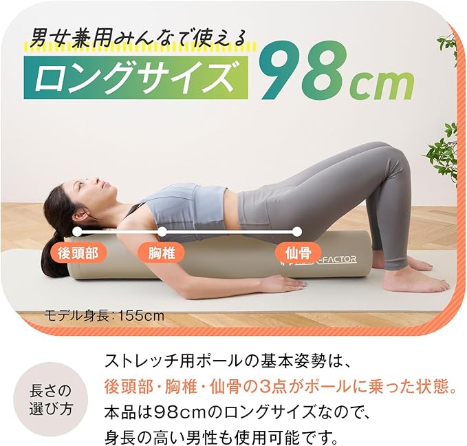 ✅ハルクファクターのストレッチ用ポール(エクササイズポール)は98cmのロングサイズ。男女問わず、無理なく上半身を載せることができます。
