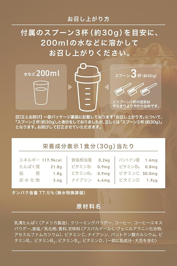 【お召し上がり方】付属のスプーン3杯(約30g)を目安に、200mlの冷たい水などに溶かしてお召し上がりください。