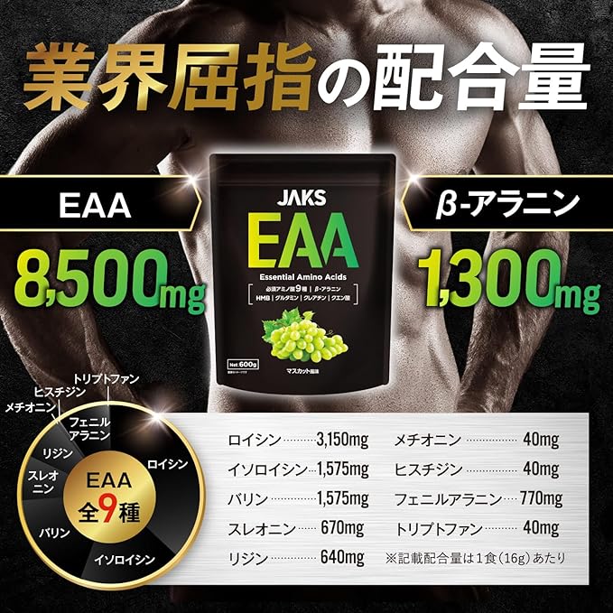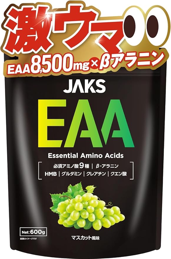 JAKS EAA マスカット風味 600g EAA8,500mg配合 高配合 BCAA ベータアラニン1,300mg クレアチン グルタミン クエン酸 HMB 必須アミノ酸 ビタミン11種 ジャックス | oioioichan