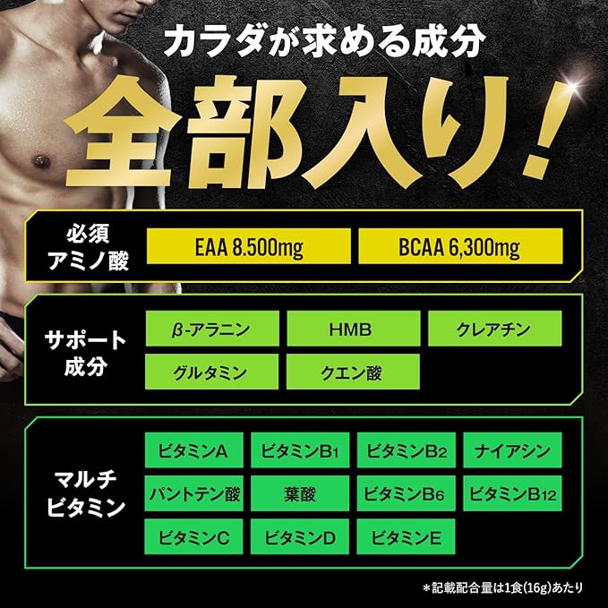 ✅【オールインワン配合】EAAに加えて、β-アラニン1,300mg、HMB、グルタミン、クレアチン、クエン酸と筋肉に欠かせない成分をオールインワン配合。