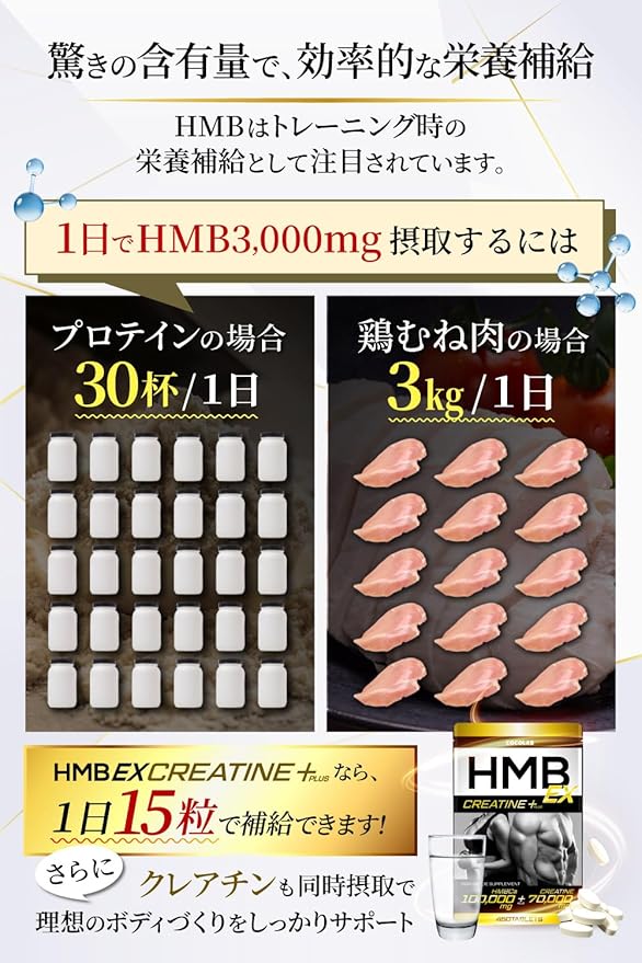 ✅【業界高ランク配合HMBCa】HMBとは必須アミノ酸のロイシンの代謝物。ハードなトレーニングに必要なHMB量は3,000mgと言われており、筋肉を作り出したり、筋肉の修復をする為に欠かせない重要な成分です。また、HMBと同時摂取することで相乗効果が期待できるクレアチンも高配合。1日15粒で3,000mg以上のHMB、2,000mg以上のクレアチンが摂取可能です。