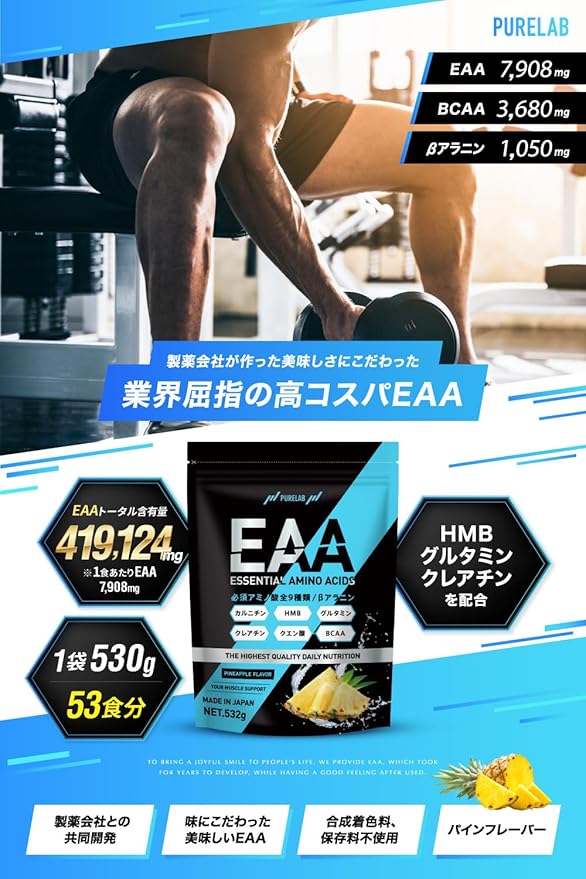 ✅【業界トップクラスのコストパフォーマンス】EAA:7,908㎎/BCAA3,680㎎と高配合。 1食約10gで約53食分摂取頂けます。 またβアラニンも1食あたり1,050㎎摂取可能です。 更にグルタミン、クレアチン、HMB、カルニチンも配合しております。
