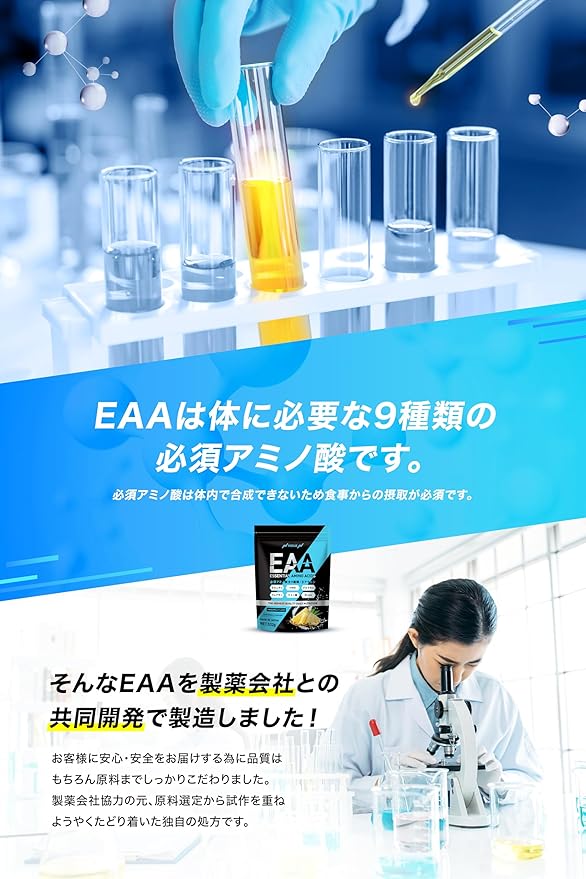 ✅【EAAとは】体内では合成できない必須アミノ酸9種類(バリン、ロイシン、イソロイシン、リジン、フェニルアラニン、トレオニン、メチオニン、ヒスチジン、トリプトファン)をすべてを配合しております。