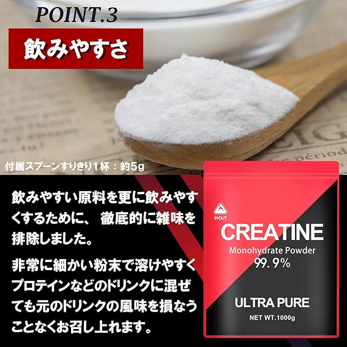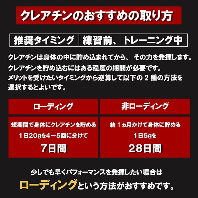 【お召し上がり方】1食あたり付属スプーンすりきり1杯(5g)を目安に、水やお好みのドリンクに溶かしてお召し上がり下さい。 筋肉にクレアチンを効果的に取り込むために炭水化物やプロテインと同時に摂取することをおすすめします。■おすすめの摂取タイミング: ①トレーニング前 ②トレーニング中 ③起床後 などに1日5gを目安に毎日継続して摂取することが重要です。■柄が長く奥底まですくいやすい付属スプーンを「袋の外側に貼り付けて」お届けします。届いたその日からお召し上がりいただけます。クレアチンモノハイドレート (99.9%以上の高純度) ●原産国名:中国