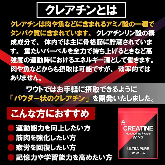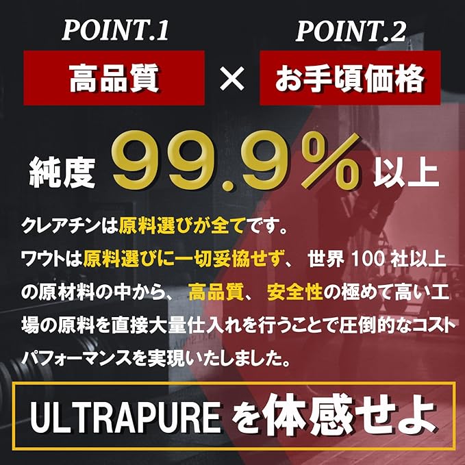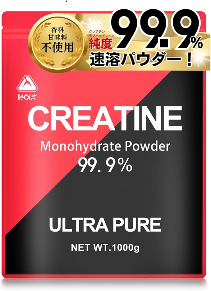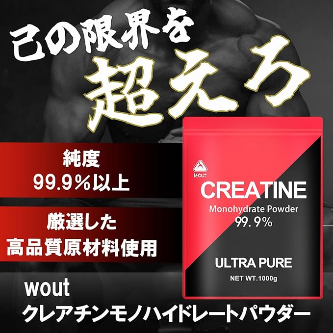 【最高純度99.9%】クレアチンモノハイドレート 1,000,000mg配合 (1回あたり目安5,000mg)クレアチンはスポーツの中でも特にその純度が重要です。 Wout は世界中の原料メーカーの中から厳選した純度「99.9%以上」かつ安全性の高いGMP適合認定工場のクレアチンパウダーを使用しております。