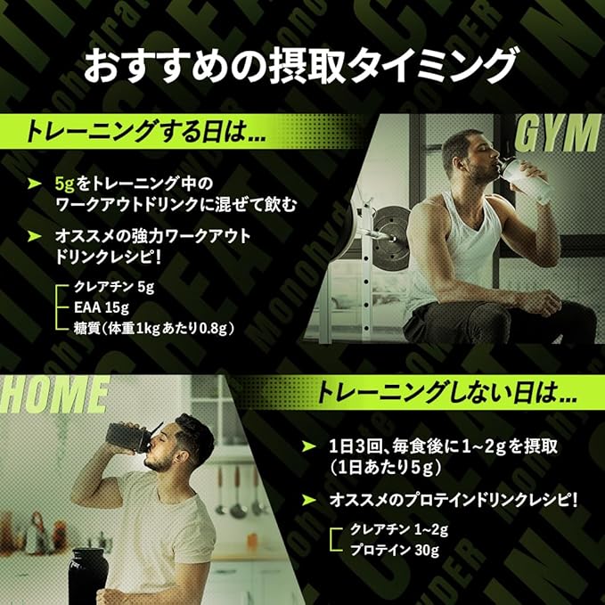 ✅おすすめのお召し上がり方①5gをトレーニング中のワークアウトドリンクに混ぜて飲む(クレアチン5g+EAA15g+糖質(体重1kgあたり0.8g) ②毎食後に1~2gを飲む (クレアチンはインスリンの働きによって細胞の中に運ばれるので、食後に飲むと吸収が良くなります。