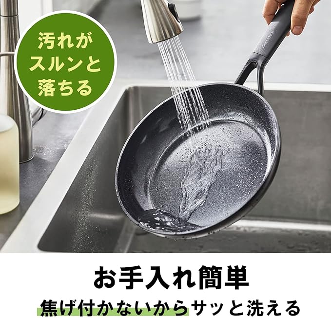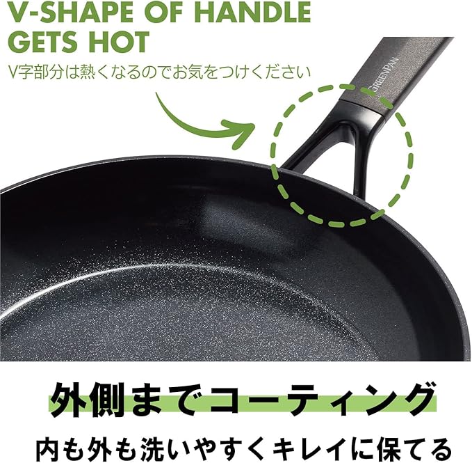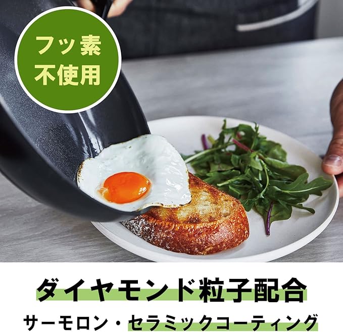 ノンスティックコーティングでこびりつきにくく、ダイヤモンド粒子配合で熱伝導率・熱拡散率に優れています