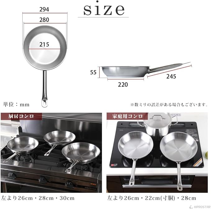 【サイズ】内径 280mm 外径 294mm 高さ 55mm 底面 220mm 【調理面のサイズ】直径215mm【取っ手長さ】約 245mm 【重量】約 1300g