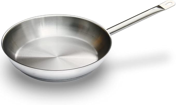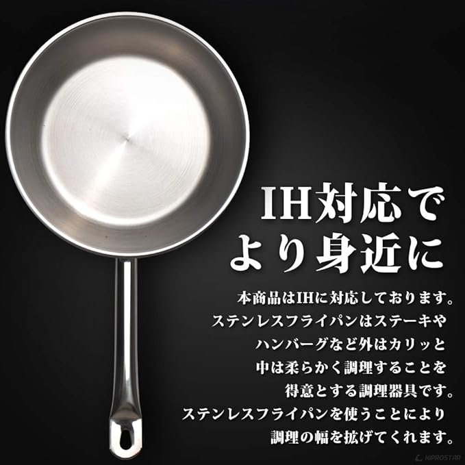 ●ご使用の際のコツ こびりつきにくくするには ステンレスフライパンは調理前に予熱をするのが大事です。 (1)調理前に中火で2~3分程度予熱をしてください。 水を垂らして水が丸い状態でコロコロ転がる状態になるまで温めてください。 温めが足らないと水が転がらずにその場で蒸発してしまう為、もう少し温めが必要となります。 (2)油を入れ、フライパン全体に馴染ませ1分間程中火で温め続けます。 油を入れた瞬間、油に小さな気泡が出ていれば、フライパンが十分温まっている状態です。 (3)1分程温めたら、火を止め、フライパンをある程度冷まします。 (4)フライパンが冷めたら、弱火~中火で調理を始めてください。 フライパンが温まらないうちに食材を入れてしまうと、こびりつきの原因になります。 調理の際、多めの油を鍋全体に入れ、十分に加熱してから食材を入れると焦げ付きにくくなります。
