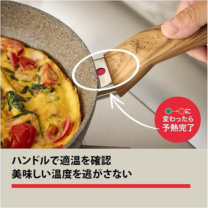 サーモポイントで簡単調理!適温が一目で分かる / 適温で調理スタート、空焚きを防ぎ、フライパンの寿命を延ばします。