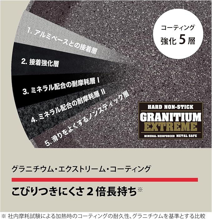金属ヘラも使える!耐久性抜群の5層コーティング / ミネラル配合の「グラニチウム・EXコーティング」で焦げ付きにくさと美しさを両立。