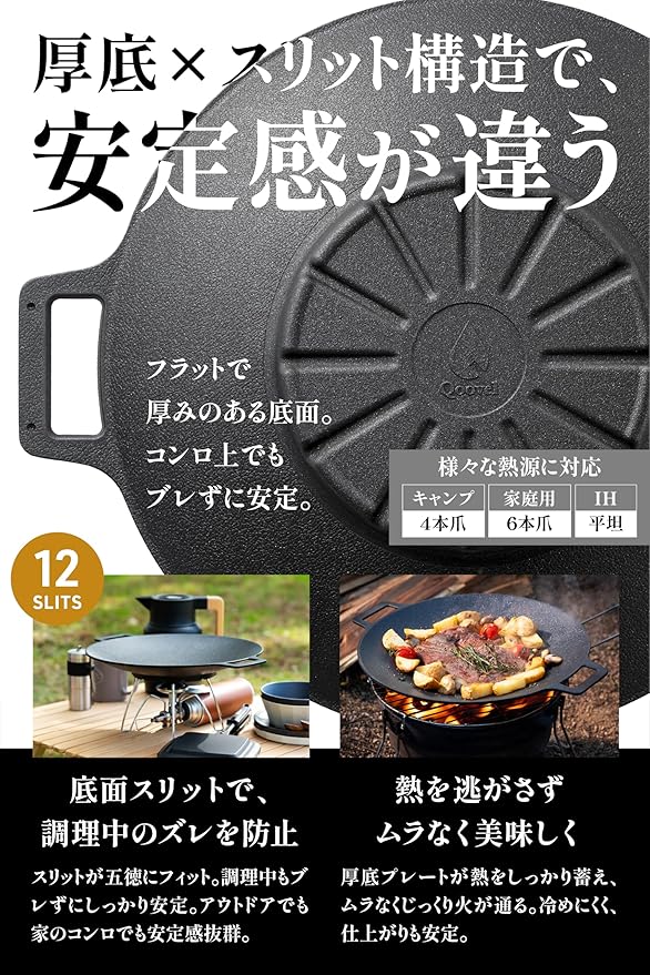【ズレにくい構造と均一加熱】底面の12スリットが、五徳や焚き火台にしっかりフィット。厚みのあるプレートが熱をムラなく伝え、中心部までしっかり加熱します。