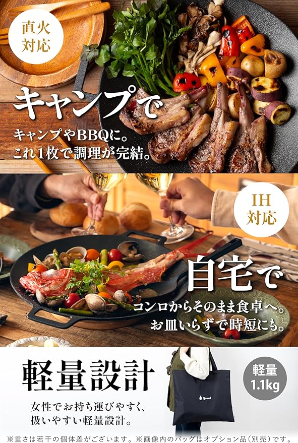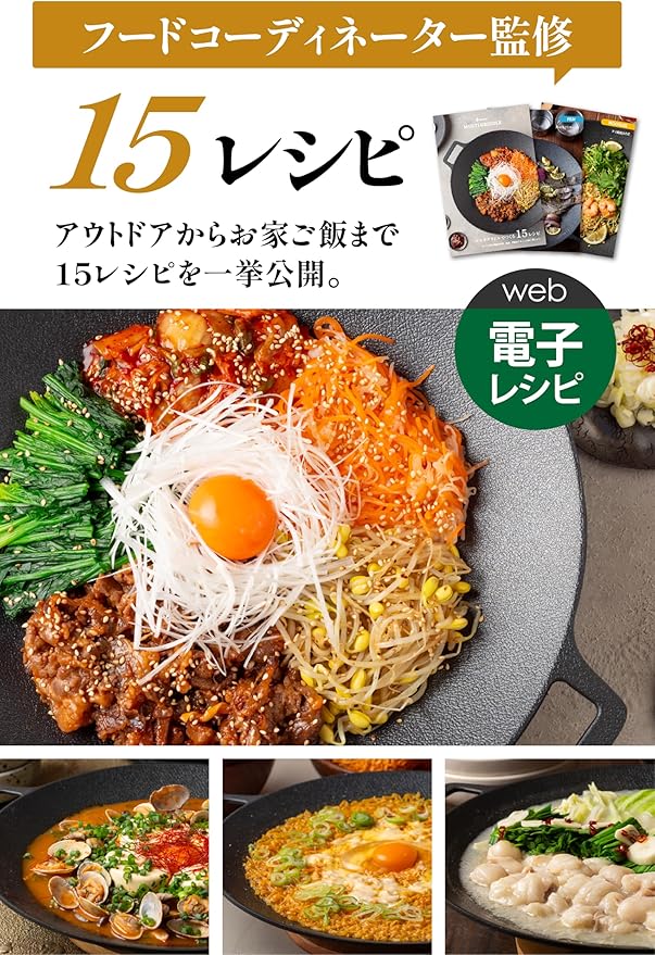 【焼く・煮る・蒸す・揚げる、これ1枚で完結】炒め物から煮込み、揚げ物までOK。IH・直火・ガス火・焚き火に対応し、これ1枚でフライパン&鍋の代わりに。キャンプでも自宅でも活躍し、15レシピ(電子版)付きで使い方が広がります。